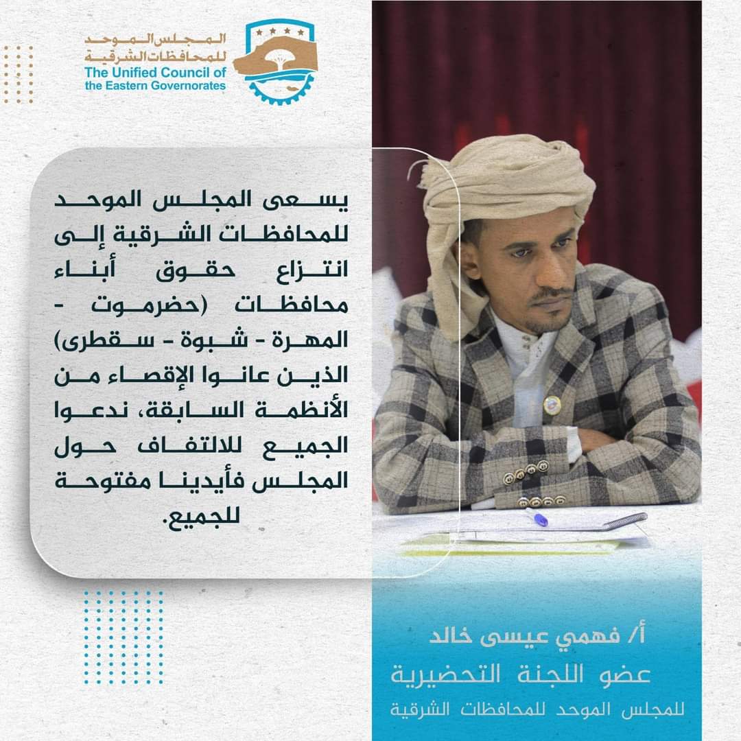 رئيس اللجنة التحضيرية للمجلس الموحد يؤكد على ضرورة حضور فاعل للمحافظات الشرقية في الدولة. ..