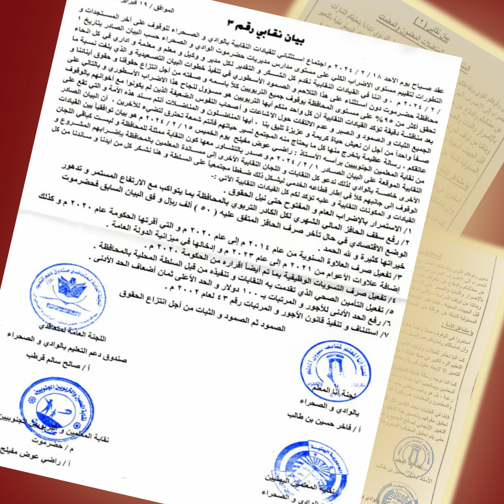 القيادات النقابية تصدر بيان حول آخر المستجدات للاضراب الكلي على مستوى مدارس وادي وصحراء حضرموت وتؤكد على مطالبها الـ7.