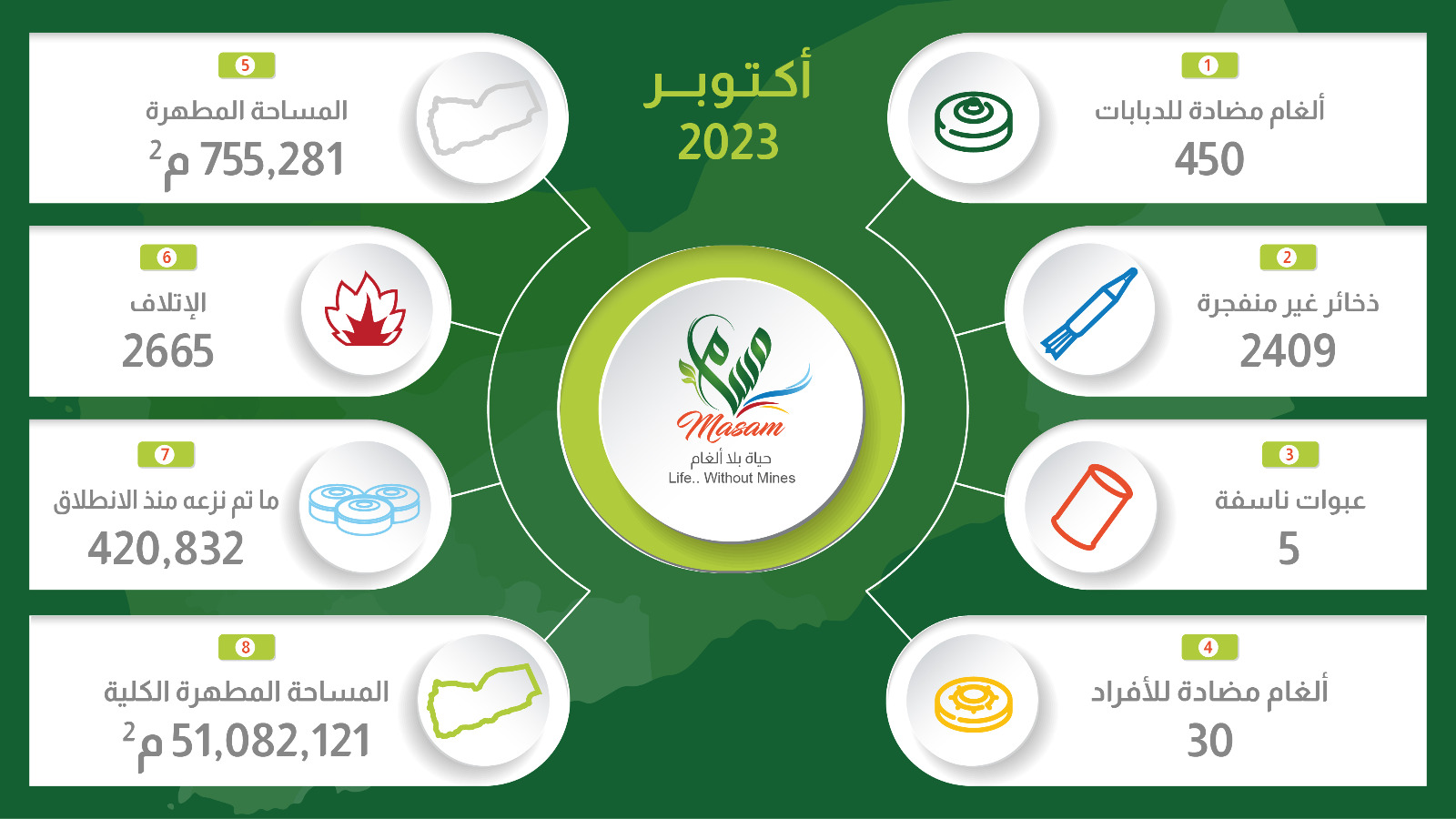 مشروع مسام يتمكن من نزع نحو ثلاثة آلاف لغماً وقذيفة غير منفجرة وعبوة ناسفة خلال شهر أكتوبر الماضي