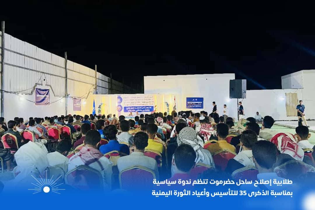 طلابية إصلاح ساحل حضرموت تنظم ندوة سياسية بمناسبة الذكرى 35 للتأسيس وأعياد الثورة اليمنية بالمكلا .