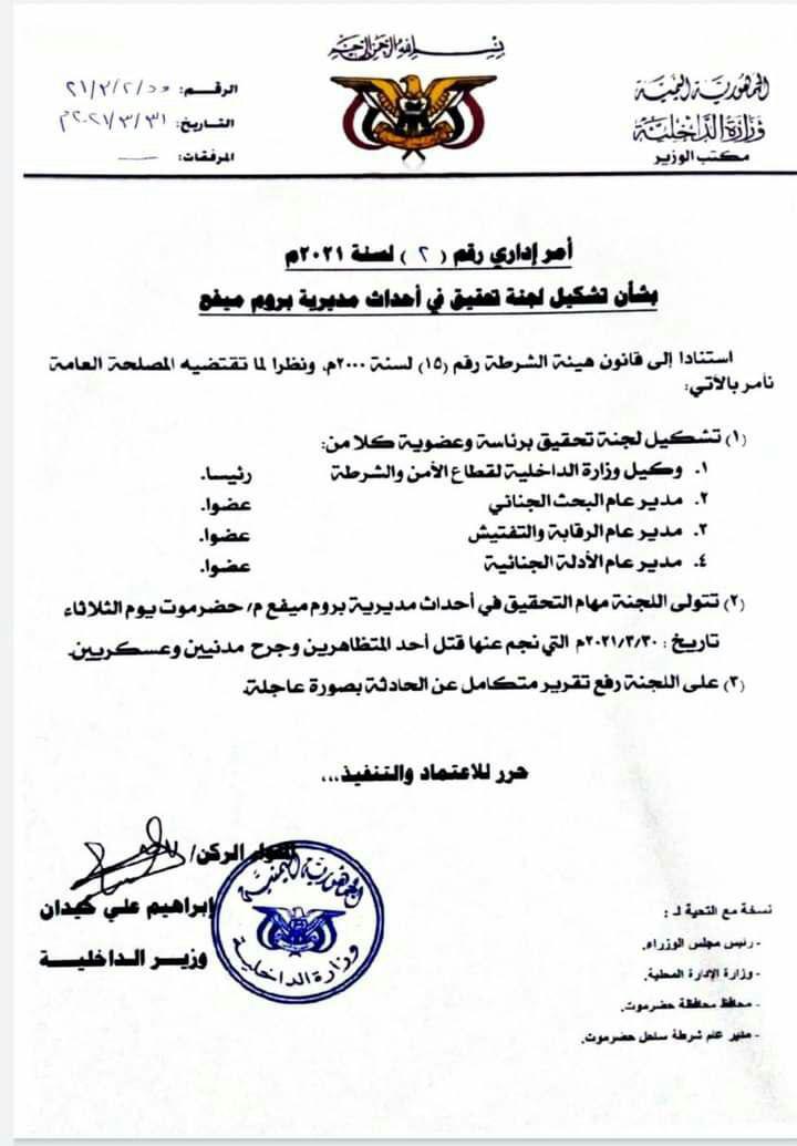 وزير الداخلية يصدر قرار بتشكيل لجنة تحقيق في أحداث مديرية بروم ميفع