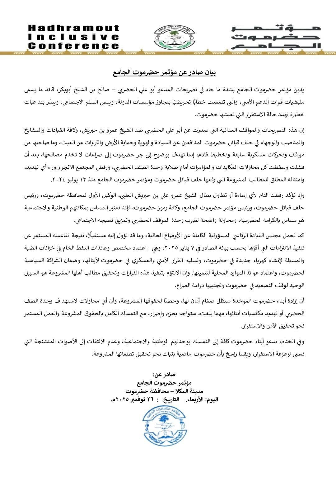 مؤتمر حضرموت الجامع يحذر من التصعيد ويدعو للحفاظ على السلم الاجتماعي