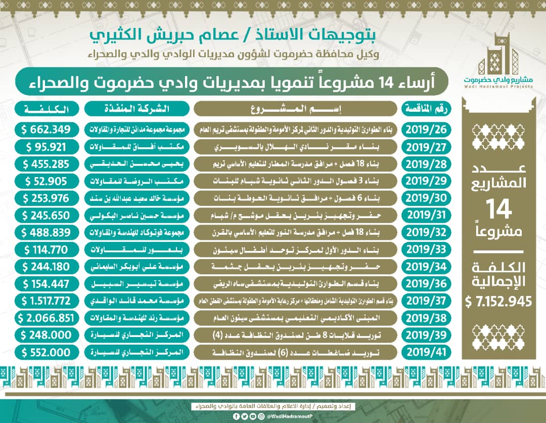 14 مشروعاً تنموياً ترسي عليه لجنة المناقصات بوادي حضرموت سيرى النور قريباً