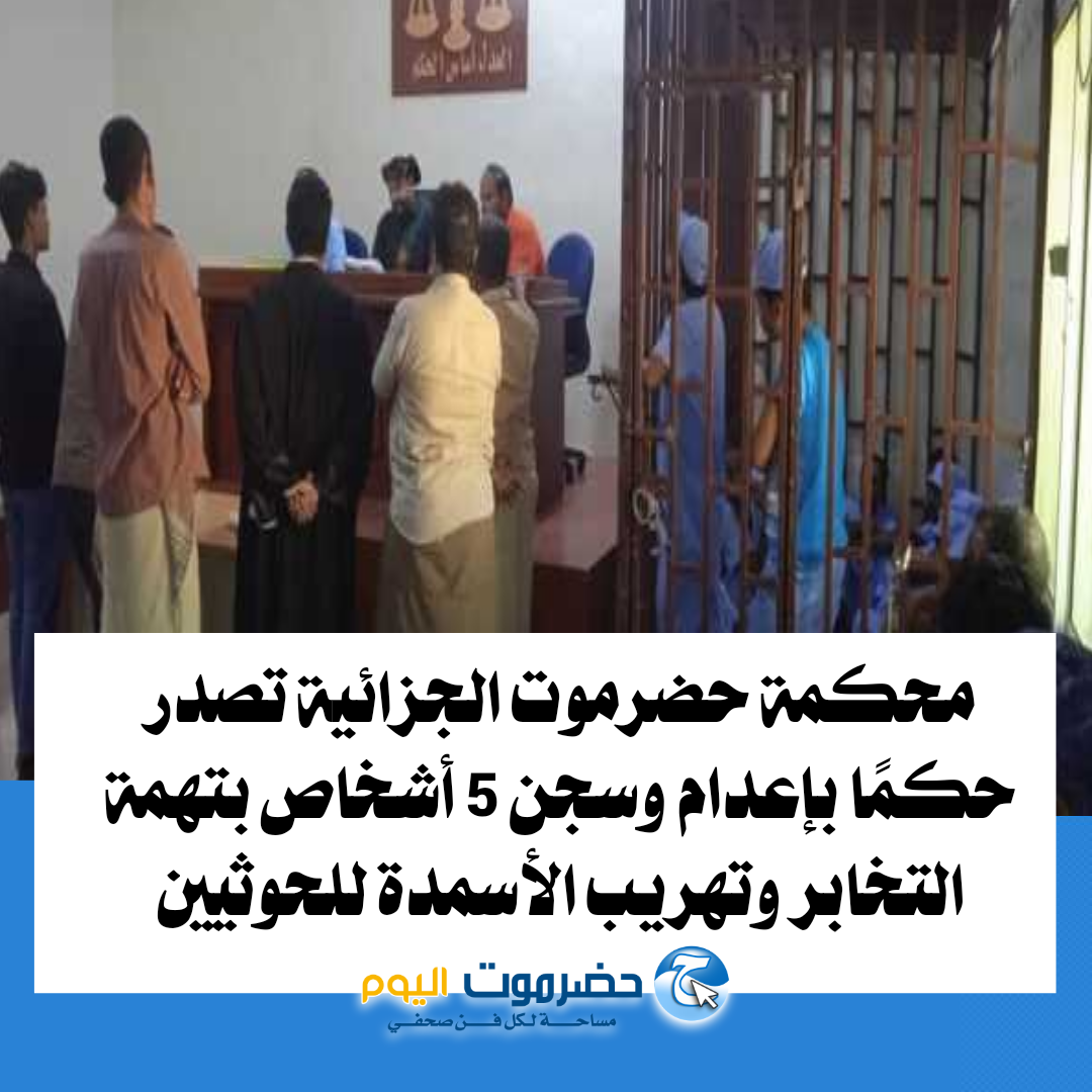 محكمة حضرموت الجزائية تصدر حكمًا بإعدام وسجن 5 أشخاص بتهمة التخابر وتهريب الأسمدة للحوثيين.