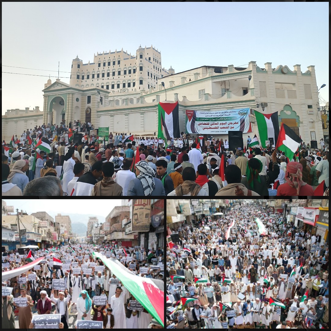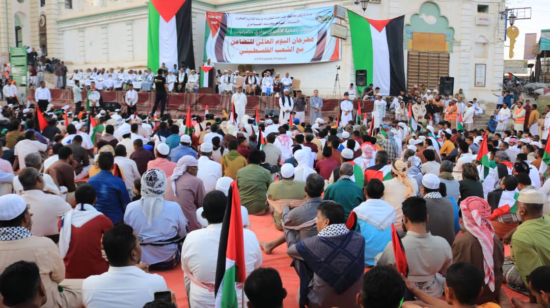 شهدت مدينة سيئون، بمحافظة حضرموت، مهرجانا تضامنيا حاشدا دعماً لغزة وللشعب الفلسطيني، تزامنا مع اليوم