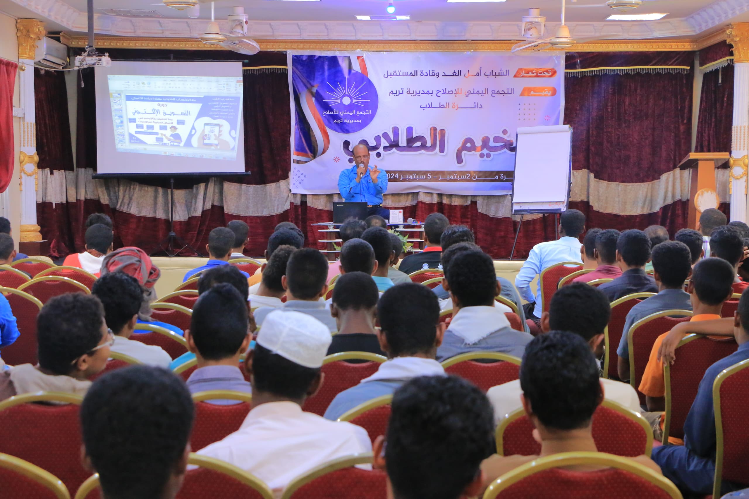 دشّنت دائرة الطلاب بالتجمع اليمني للإصلاح بمديرية تريم المخيم الطلابي تحت شعار "الشباب أمل الغد وقادة