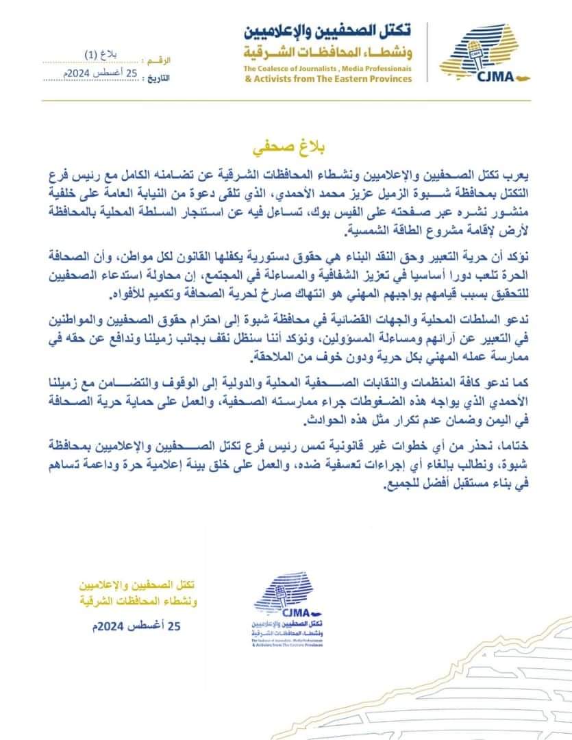 أعلن تكتل الصحفيين والإعلاميين ونشطاء المحافظات الشرقية عن تضامنه الكامل مع رئيس فرع التكتل في محافظة شبوة،