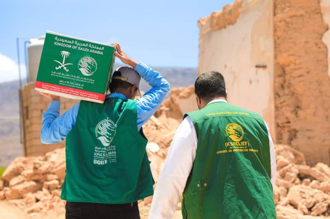 فريق من مركز الملك سلمان للإغاثة يطلع على توزيع المساعدات الغذائية بمديرية حصوين .