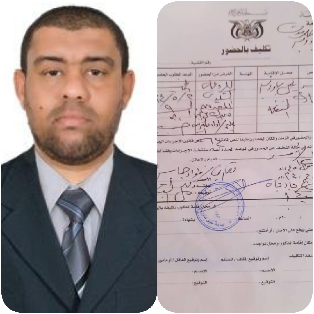 على خلفية دفاعه عن حقوق المعلمين النيابة تستدعي الزميل الاعلامي أحمد باحمادي للتحقيق في شكوى تقدمت بها إدارة التربية والتعليم بحضرموت.
