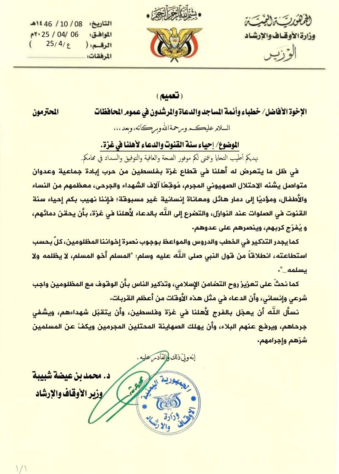 وزارة الأوقاف والإرشاد تدعو لإحياء سنة القنوت وتضامن المسلمين مع أهل غزة