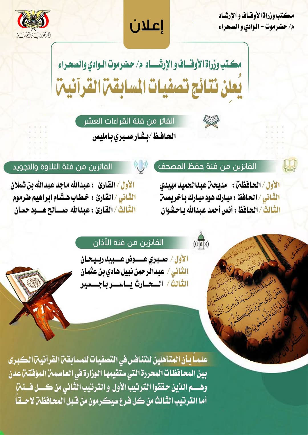 أعلن مكتب وزارة الأوقاف والإرشاد بمحافظة حضرموت - الوادي والصحراء، عن أسماء الفائزين في تصفيات المسابقة
