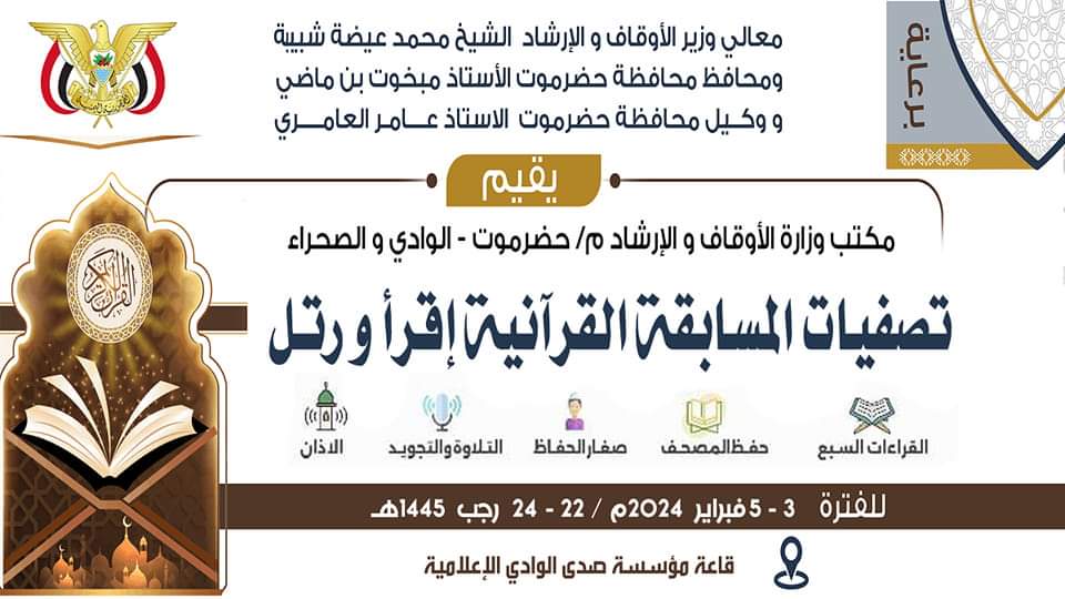 أعلن مكتب الاوقاف والارشاد بوادي وصحراء حضرموت بعد انتهاء التصفيات الأولية للمسابقة القرآنية إقرا و رتل ،