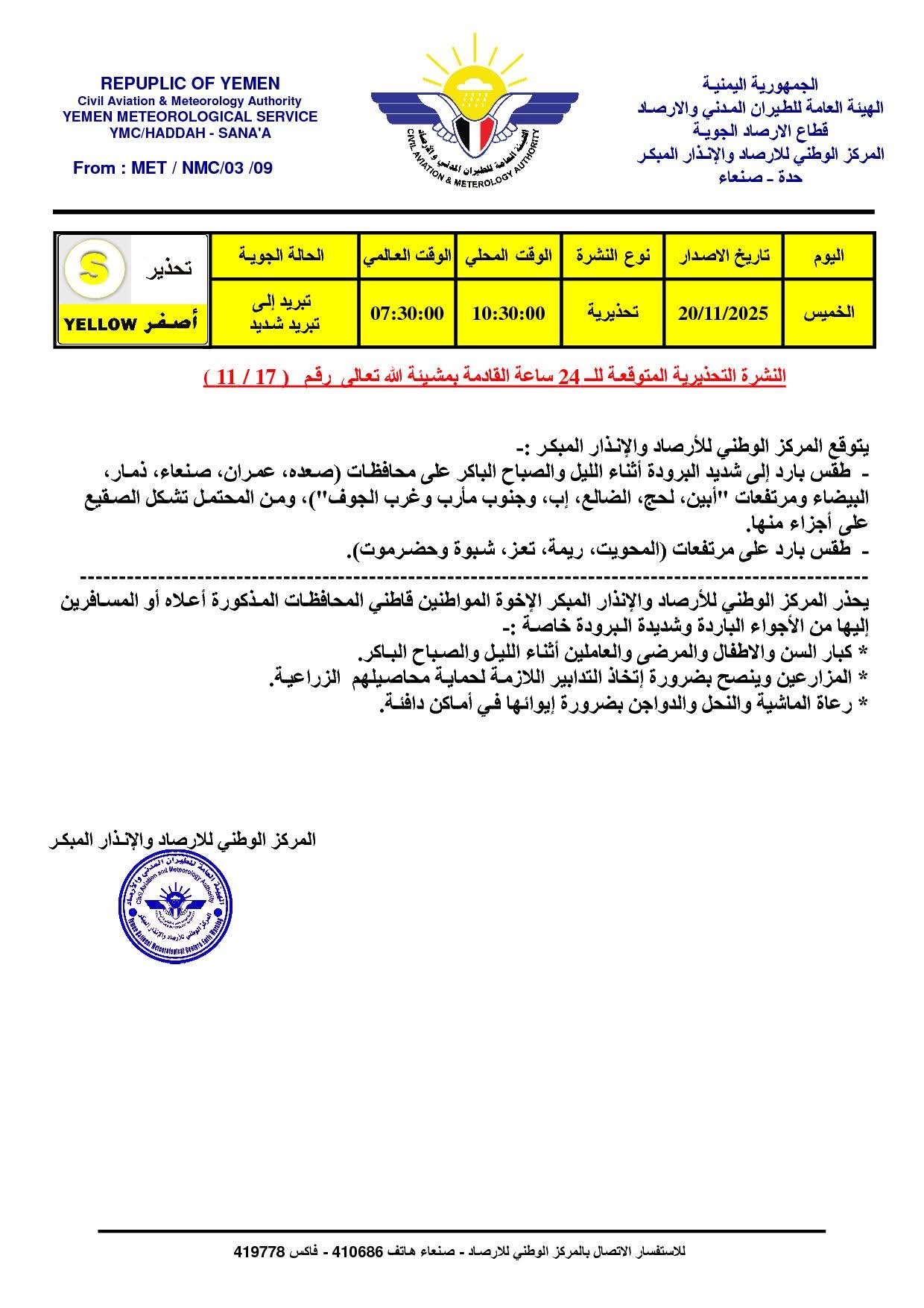 حذّر المركز الوطني للأرصاد الجوية من موجة برد شديدة تضرب المرتفعات الجبلية خلال ليل وصباح الخميس 20 نوفمبر،
