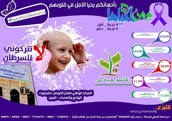 أطلق المركز الوطني لعلاج الأورام بحضرموت الوادي والصحراء حملته السنوية لدعم مرضى الأورام المترددين على