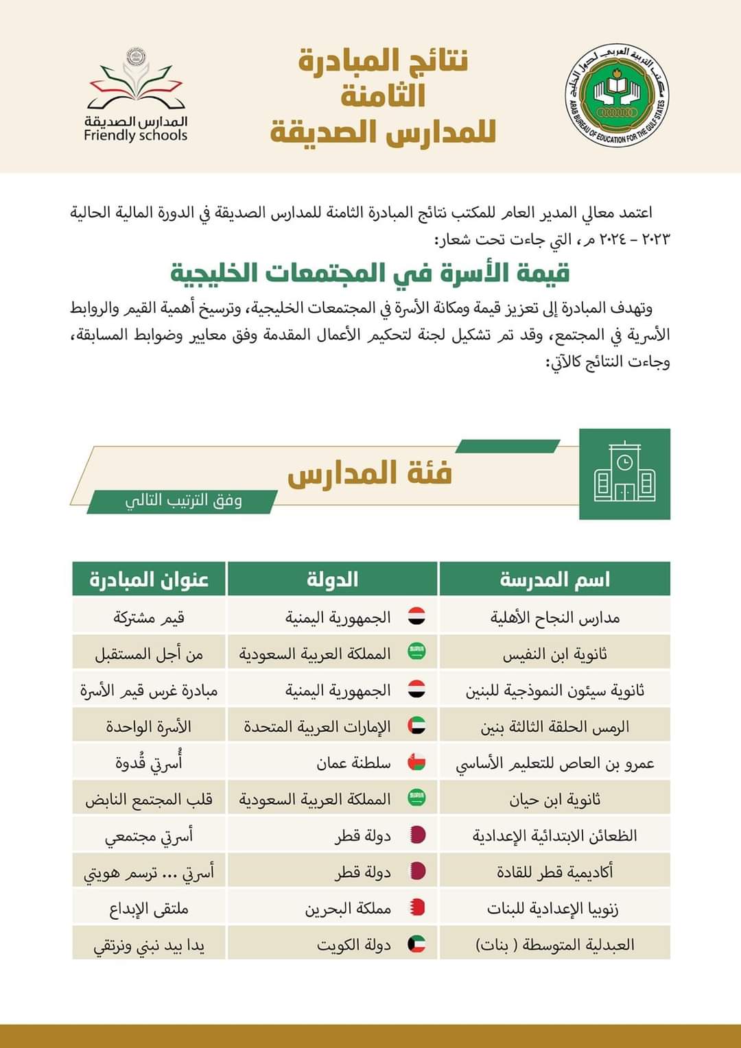 حققت مدارس النجاح الأهلية بمديرية تريم حضرموت، المركز الاول، في مسابقة المبادرة الثامنة للمدارس الصديقة