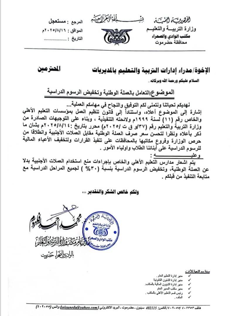 أصدر مكتب التربية والتعليم بوادي حضرموت تعميمًا يُلزم المدارس الأهلية والخاصة باعتماد العملة الوطنية