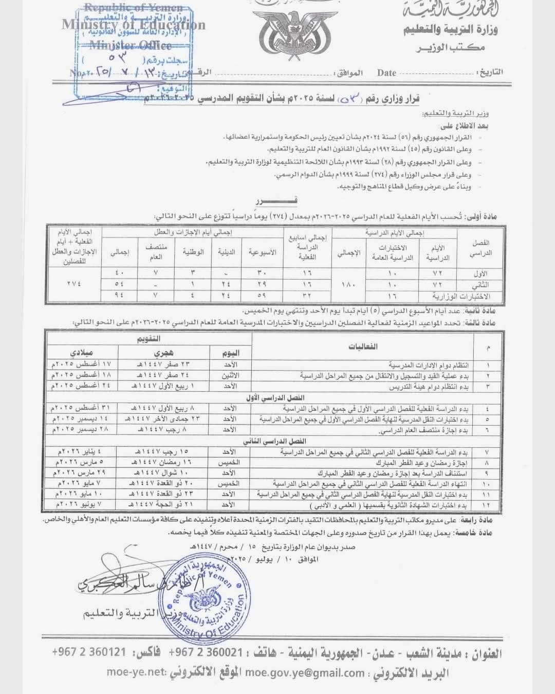 أعلنت وزارة التربية والتعليم، اليوم، أن العام الدراسي الجديد 2025-2026م سيبدأ رسميًا يوم الأحد 31 أغسطس المقبل في