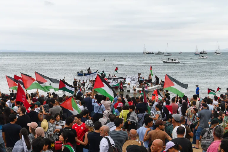 تدفق آلاف التونسيين، اليوم الأربعاء، إلى شاطئ سيدي بوسعيد لدعم أسطول "الصمود" الذي سيبحر باتجاه غزة، في