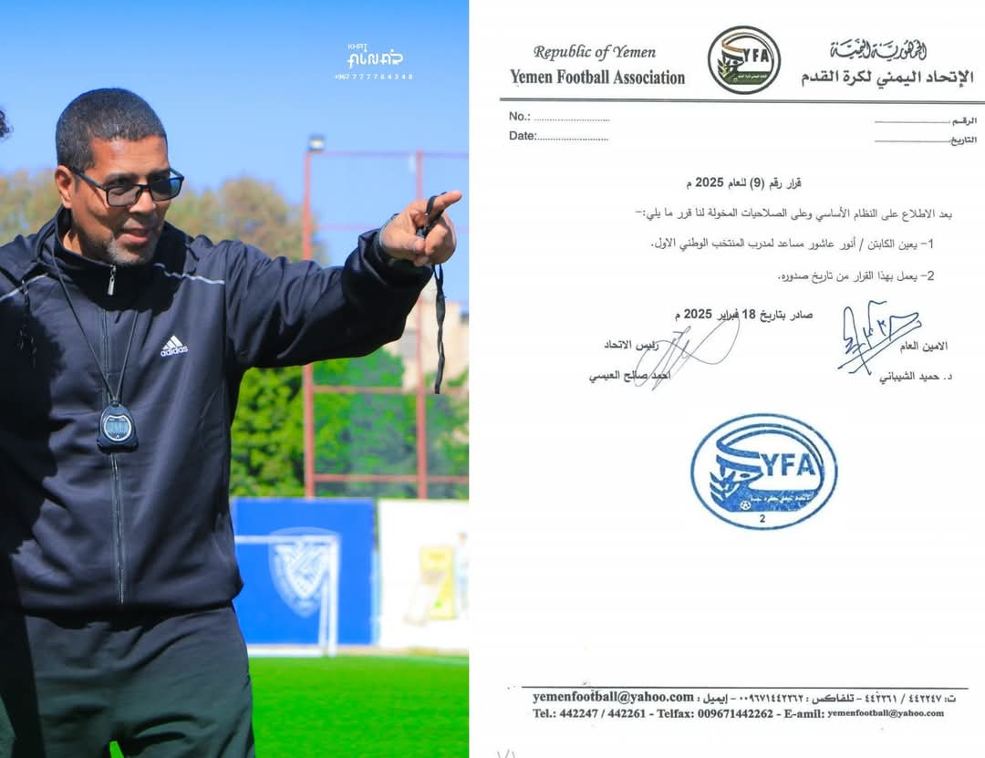 أعلن الاتحاد اليمني لكرة القدم، اليوم الثلاثاء، تعيين أنور عاشور مساعدًا للمدرب الجزائري نور الدين ولد علي،