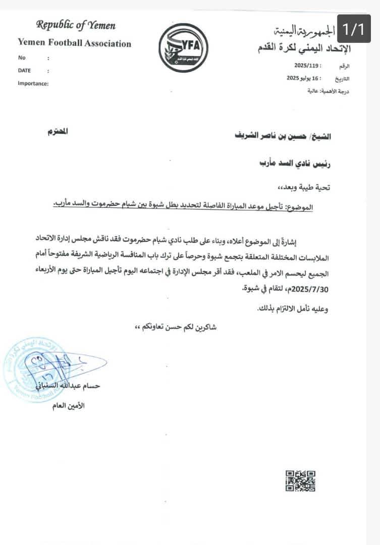 أعلن الاتحاد العام اليمني لكرة القدم تأجيل المباراة الفاصلة لتحديد بطل تجمع شبوة لأبطال المحافظات بين فريقي