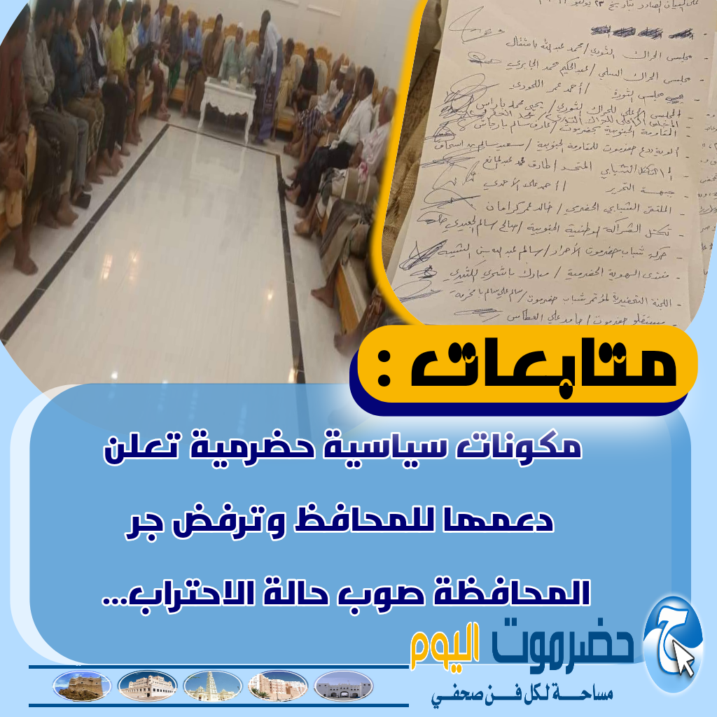 أعلنت مكونات سياسية حضرمية دعمها لمحافظة حضرموت مبخوت بن ماضي رافضة أي محاولات لجر المحافظة صوب أي عمليات