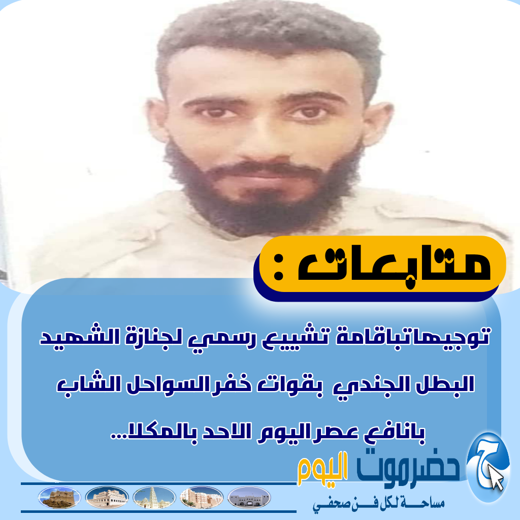 وجه محافظ حضرموت الأستاذ مبخوت مبارك بن ماضي، باعتماد تشييع رسمي لجنازة الشهيد البطل الجندي بقوات خفر