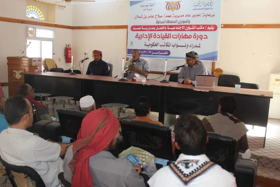 برعاية مدير عام المديرية وتمويل السلطة المحلية مكتب الشؤون الإجتماعية والعمل بمديرية عمد ينظم دورة مهارات القيادة الإدارية لمدراء ونواب مدراء المكاتب الحكومية…
