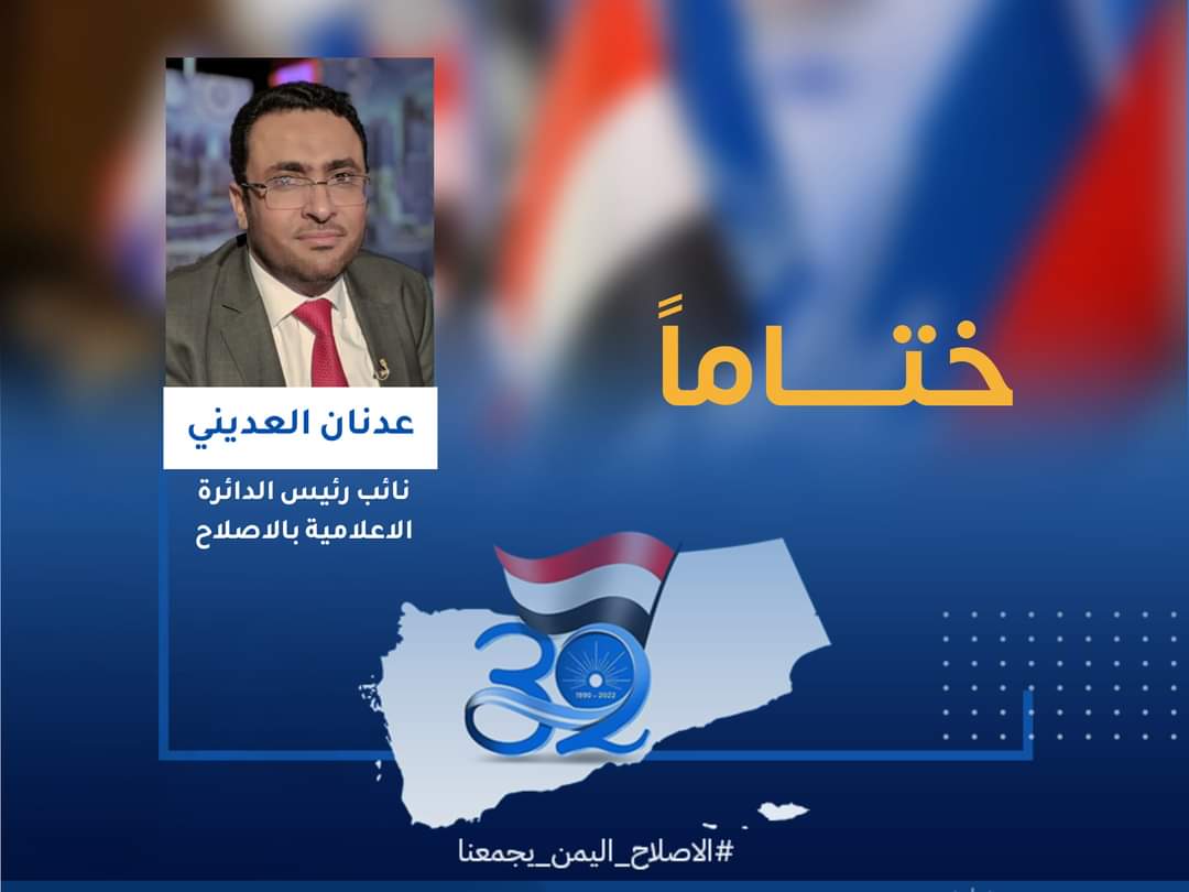 عدنان العدينينائب رئيس الدائرة الاعلامية بالاصلاح في ختام فعالية الذكرى الثانية والثلاثين لتأسيس التجمع