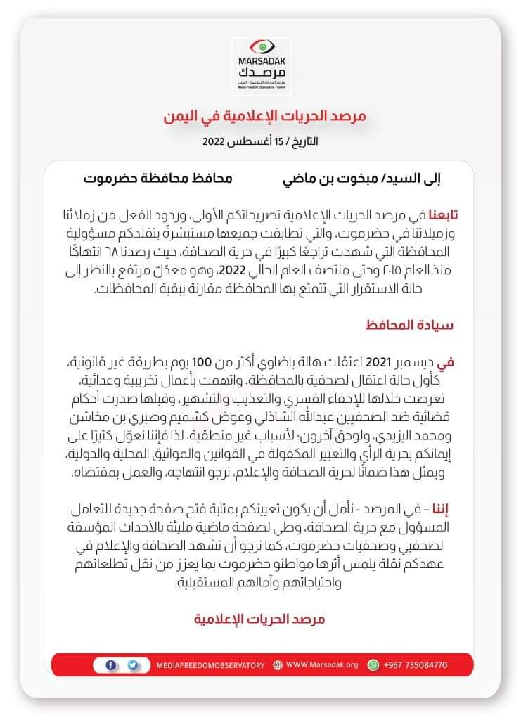 في رسالة لمحافظ حضرموت مرصد الحريات الاعلامية يطالب بضمان حرية الصحافة…