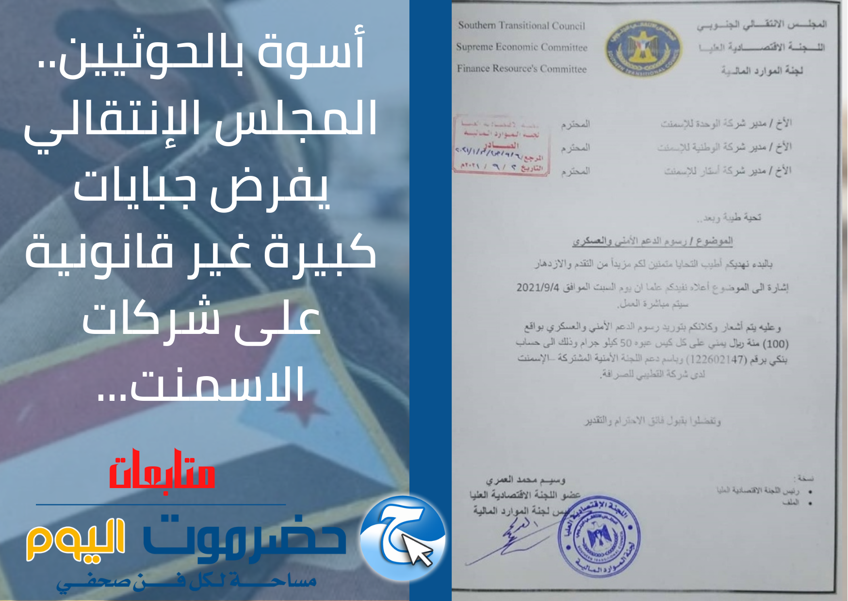 أسوة بالحوثيين.. المجلس الإنتقالي يفرض جبايات كبيرة غير قانونية على شركات الاسمنت (وثيقة)...