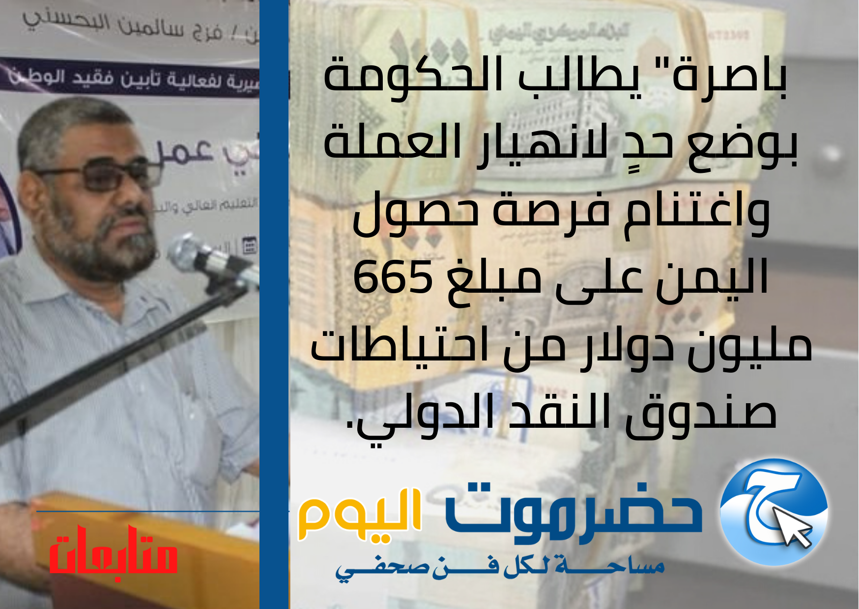 باصرة" يطالب الحكومة بوضع حدٍ لانهيار العملة واغتنام فرصة حصول اليمن على مبلغ 665 مليون دولار من احتياطات