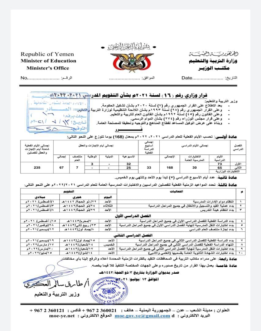 أعلنت وزارة التربية والتعليم أن العام الدراسي الجديد 2021/2022م لجميع المراحل الدراسية ستبدأ في 15 أغسطس