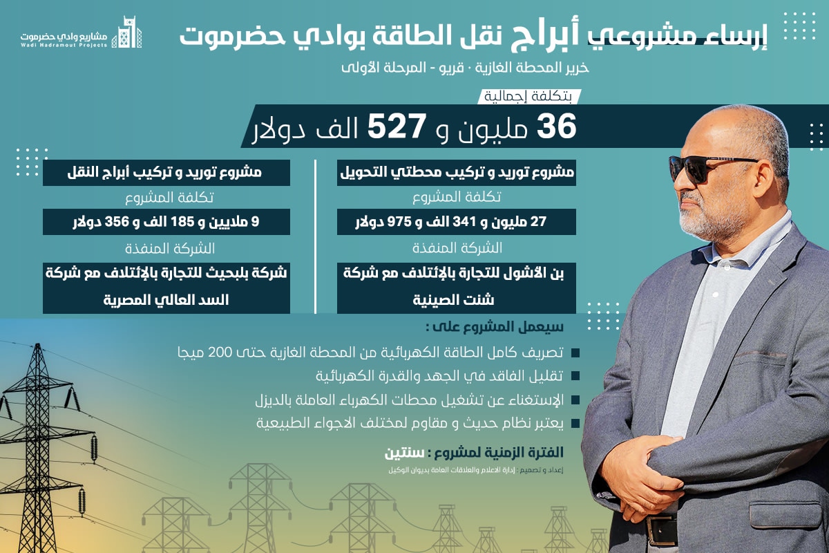 بتكلفة 36 مليون دولار .. إرساء مشروعي ابراج نقل الطاقة بوادي حضرموت برعاية من رئاسة الجمهورية و الحكومة ...