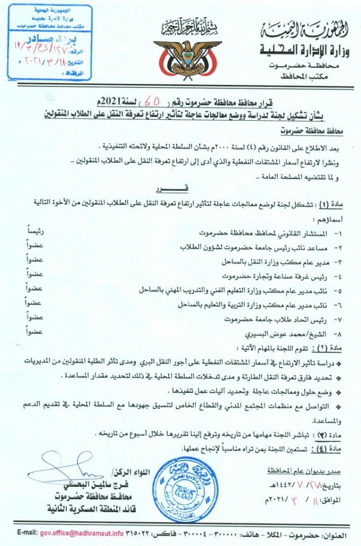 أصدر محافظ حضرموت قائد المنطقة العسكرية الثانية اللواء الركن فرج سالمين البحسني، اليوم القرار رقم ( 60 )