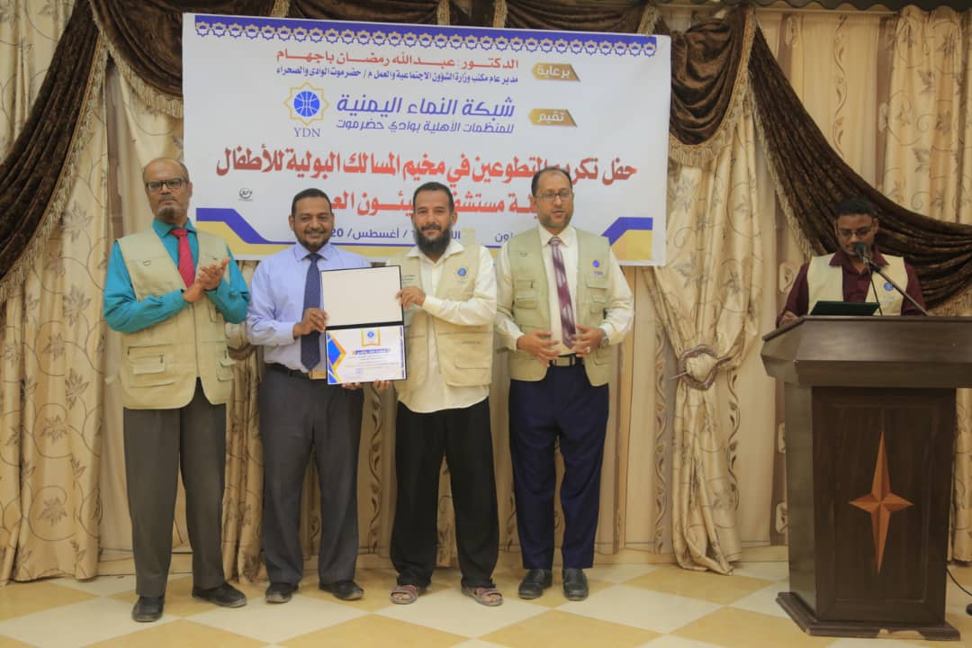 أقامت شبكة النماء اليمنية للمنظمات الأهلية YDN بوادي حضرموت اليوم حفلا لتكريم المتطوعين في مخيم المسالك