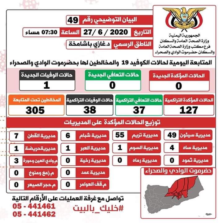 أصدر الناطق الرسمي باسم مكتب الصحة العامة والسكان بوادي حضرموت د. غازي باشامخه بيانه التوضيحي رقم 49 والخاص