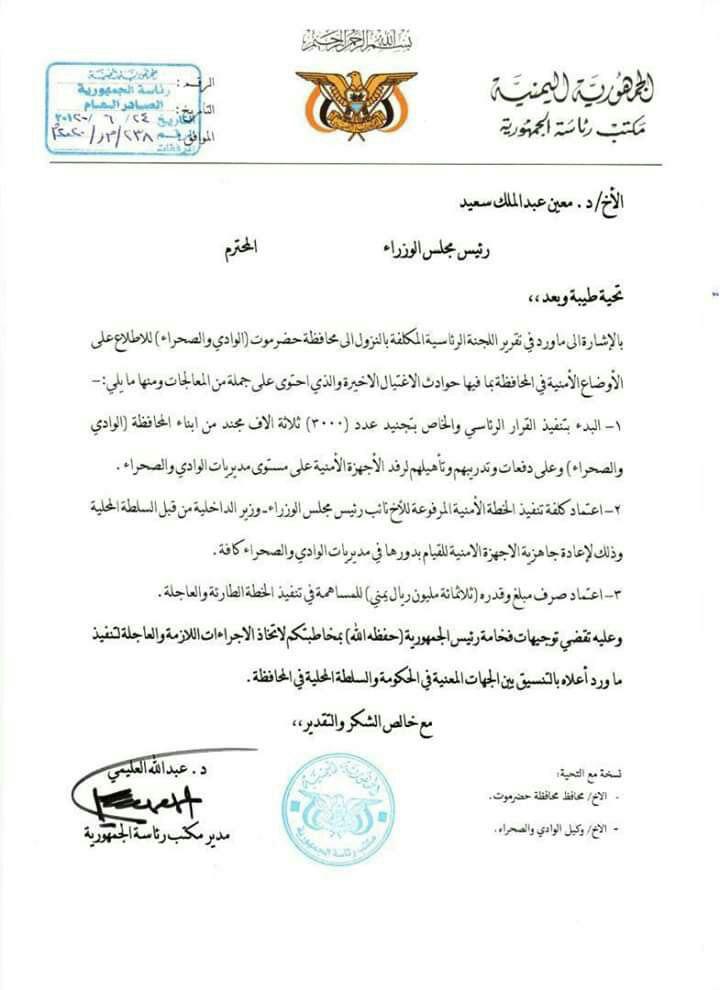 وجهت رئاسة الجمهورية الحكومة، بتنفيذ إجراءات عاجلة، تقتضي ضبط الأمن في وادي وصحراء حضرموت .   ووفقاً
