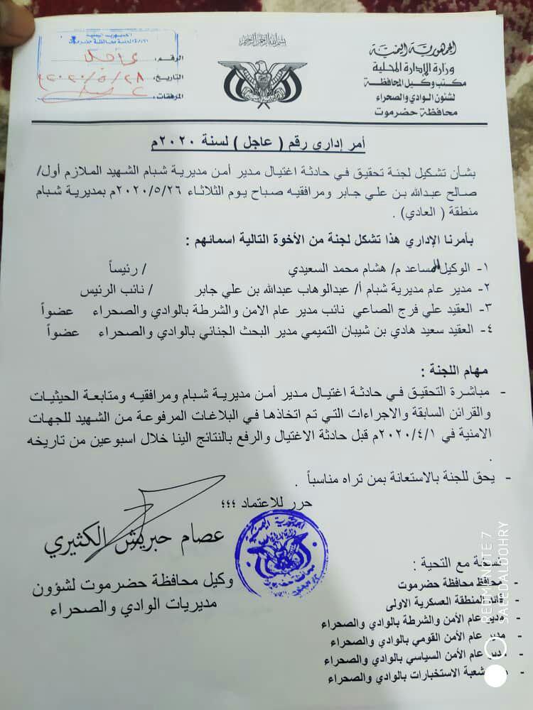 وكيل وادي حضرموت الكثيري يصدر قرار بتشكيل لجنة تحقيق في حادثة اغتيال مدير أمن شبام