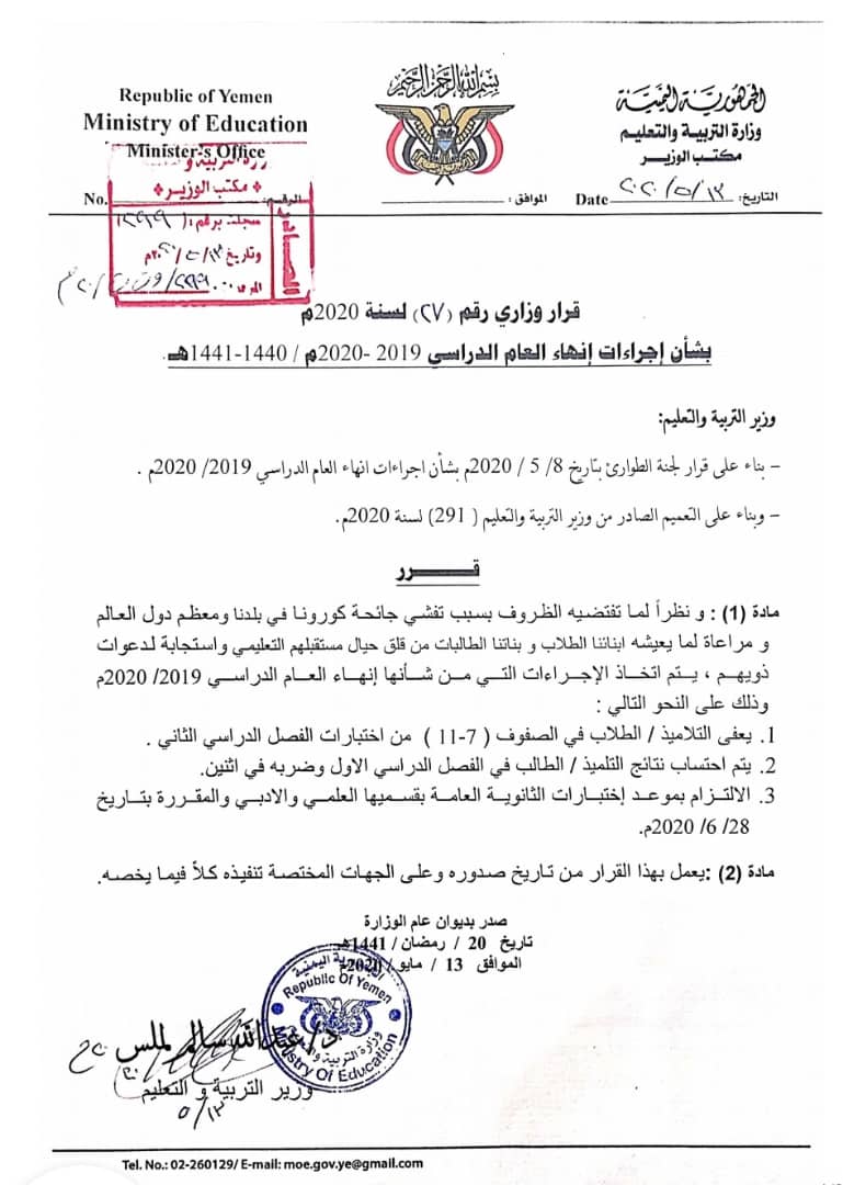 وزارة التربية تقر إعفاء طلاب الصف السابع حتى ثاني ثانوي من الامتحانات
