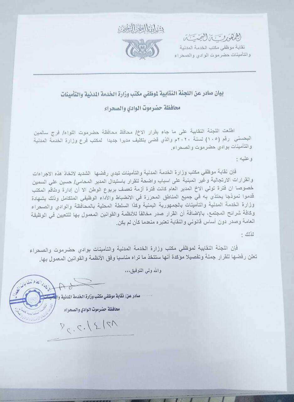 أصدرت اللجنة النقابية لموظفي مكتب الخدمة المدنية والتأمينات بوادي وصحراء حضرموت بيان ترفض فيه قرار تغيير