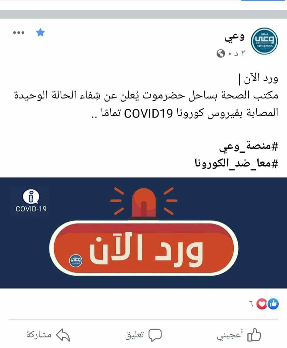 أعلن مكتب وزارة الصحة بساحل حضرموت عن شِفاء الحالة الوحيدة المصابة بفيروس كورونا COVID19 تمامًا. وأضاف، في