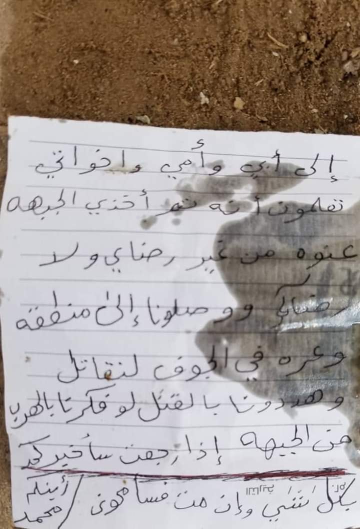 حصل جنود الجيش الوطني في محافظة الجوف، على رسالة مع أحد الأطفال الذين زجت بمهم مليشيات الحوثيين إلى محارق