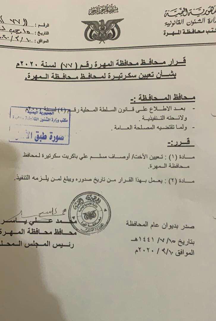 صدر اليوم قرار محافظ محافظة المهرة رئيس المجلس المحلي الأستاذ محمد علي ياسر رقم  (77) لعام 2020م  قضت