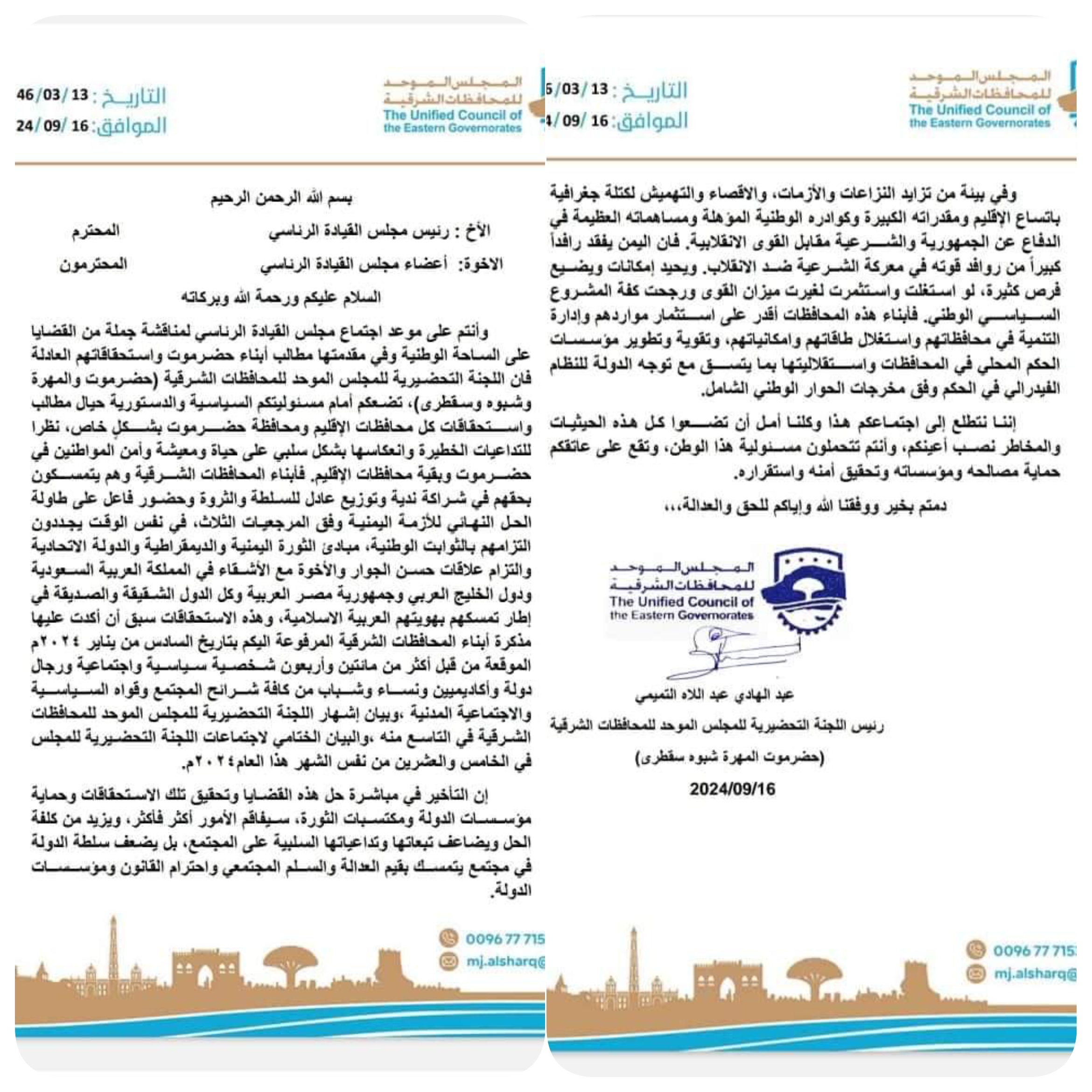وجه عبدالهادي التميمي، رئيس اللجنة التحضيرية للمجلس الموحد للمحافظات الشرقية، رسالة رسمية إلى رئيس وأعضاء
