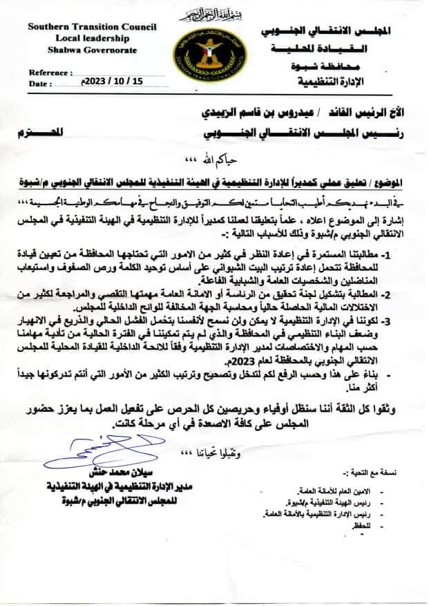 *عاجل:قيادي في انتقالي شبوة يقدم استقالته بسبب الاختلاسات المالية التي تمارسها حالياً قيادة المجلس. ..