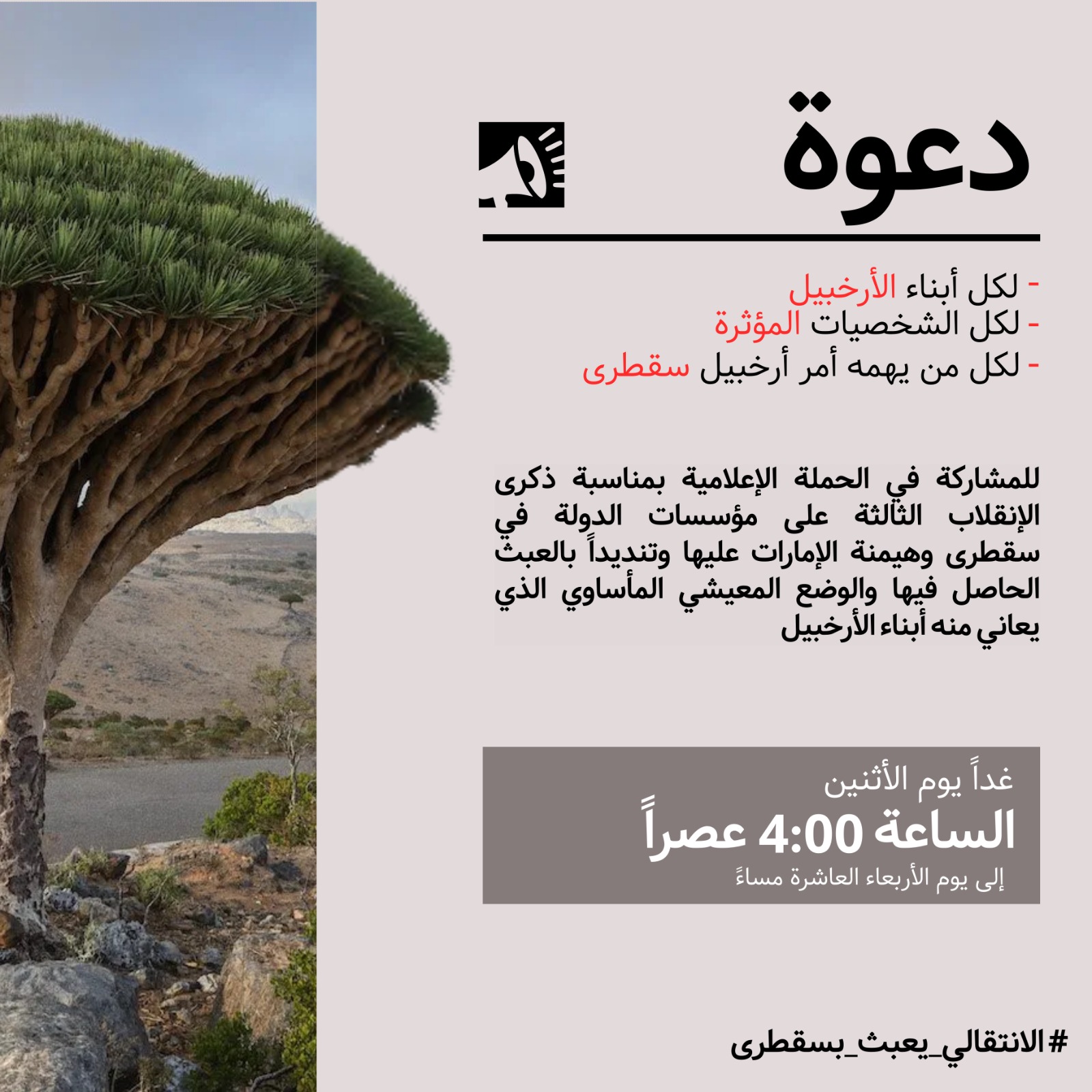 أنطلقت اليوم الساعة الرابعة مساء حملة إعلامية الكترونية للتنديد بالعبث الجاري في محافظة سقطرى الخاضعة