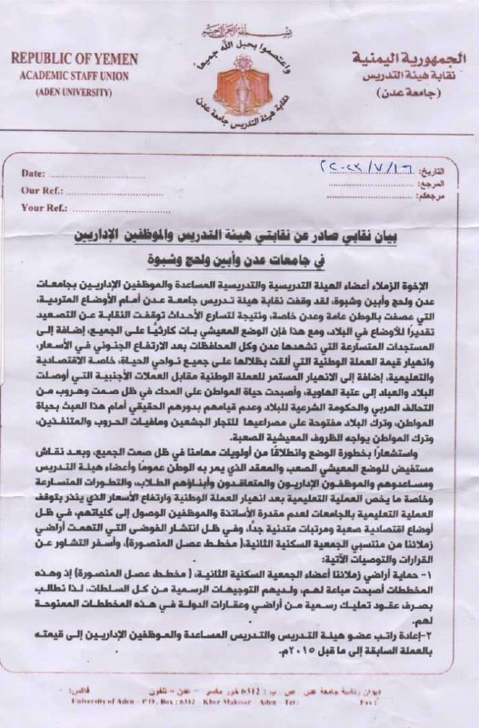 اصدرت نقابتي هيئة التدريس والموظفين الإداريين في جامعات عدن ولحج وأبين وشبوة بيان اعلنت فيه الإضراب المفتوح