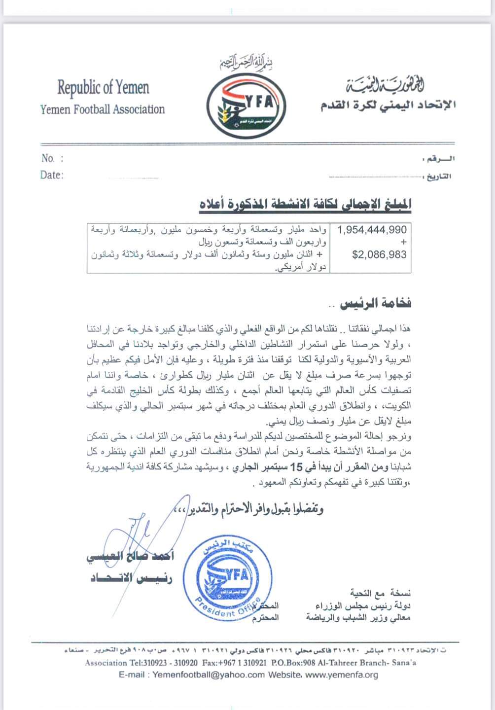 اتحاد كرة القدم يخاطب الرئيس العليمي ويطالب باثنين مليار ريال بشكل طارئ.